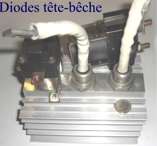 Les diodes industrielles modèles 400 Ampères crêtes sur 250 volts, récupérées sur des rebuts de pièce détachées de TGV de première génération seront court-circuitées à la demande par un relais de puissance 12 volts.  Un montage hyper simple très économique. Les diodes n'auraient pas même pas besoin d'être refroidie car elles sont très largement surdimensionnées mais comme elles sont déjà connectées en tête bêche alors autant conserver le radiateur. Reste plus qu'à fixer les 2 relais sur le radiateur. Le tout sera placé dans un coffret plastique isolant.