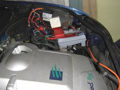 Quelques photos du montage: Les spécialistes reconnaîtront l'origine du convertisseur (c'est un convertisseur de Clio électrique qui a déjà eu sa première vie et c'est maintenant qu'il va falloir qu'il bosse très sérieusement pour la Toujours Contente !) - Le câble Orange c'est la Haute Tension. Les ventilos prennent l'air à l'endroit le frais possible. L'air sera obligé de passer sur les ailettes une fois le capot fermé, qui vient s'ajuster en appuis sur le convertisseur. On dirait que cela a été fait pour. On peut supprimer le convertisseur sans laisser la moindre trace. Le 2éme fusible libre 40A du boitier de protection batterie est aussi une chance. |