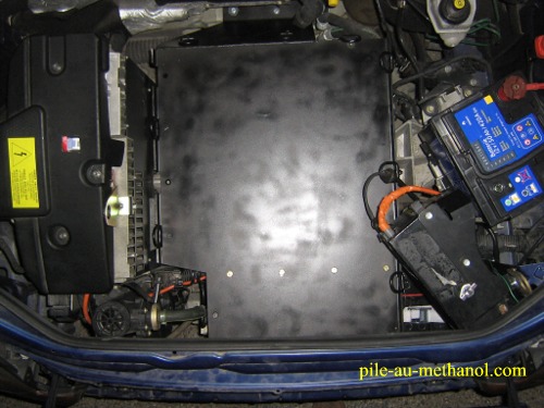 | Nouvelle vue sous le capot. Notez les attaches qui vont permettre de brider les éléments de batterie à la demande, les attaches brides sont à placer l'extérieur du bac pour éviter d'impacter les blocs batteries avec des aspérités. | ||